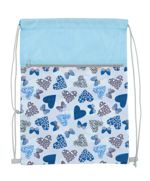 Sáčky na cvičky jsou praktickým doplňkem školní aktovky pro uložení přezůvek či věcí na tělocvik. Vodoodpudivý pevný materiál udrží věci v suchu. Kapsa na zip oddělí boty od ostatního oblečení. Stahovací šňůrka spojená se spodní částí promění sáček v malý batůžek na záda. Rozměr: 32 x 44 cm.